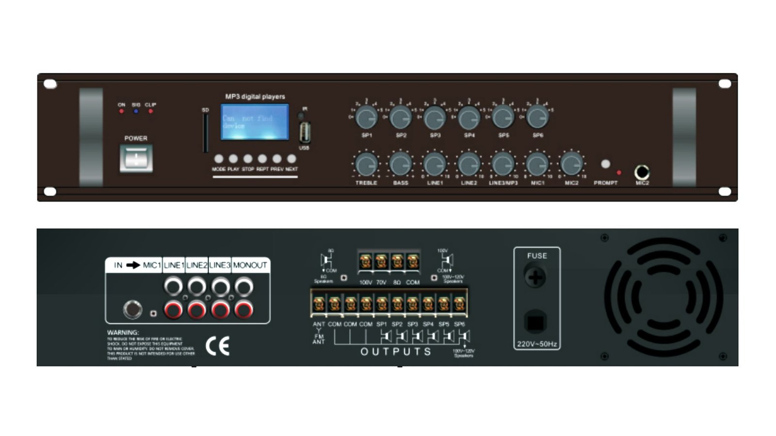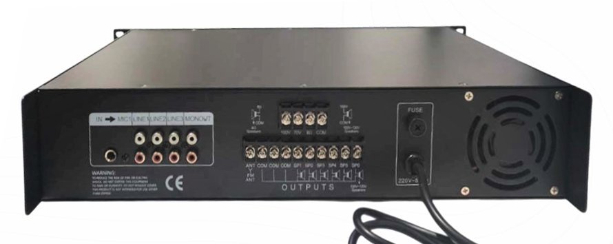 Ενισχυτής ήχου 240W με έξοδο 4–16Ω, υποστηρίζει γραμμές 70V/100V.Διαθέτει είσοδοι aux και μικροφώνου, ρύθμιση πρίμων/μπάσων, χαμηλή παραμόρφωση και υψηλή αναλογία σήματος προς θόρυβο.