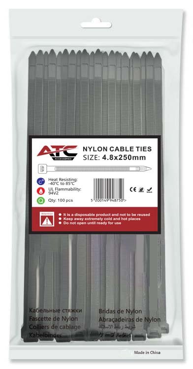 Ανθεκτικά δεματικά από νάιλον, 4.8x250mm, ιδανικά για στερέωση καλωδίων και οργάνωση καλωδίωσης. Διατίθενται σε πρακτική συσκευασία 100 τεμαχίων για εύκολη χρήση και αποθήκευση.