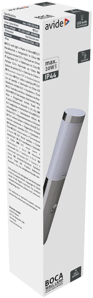 Avide Φωτιστικό τοίχου εξωτερικού χώρου Boca 1xE27 PIR IP44 Satin NickelΥλικό: Ανοξείδωτο + PC