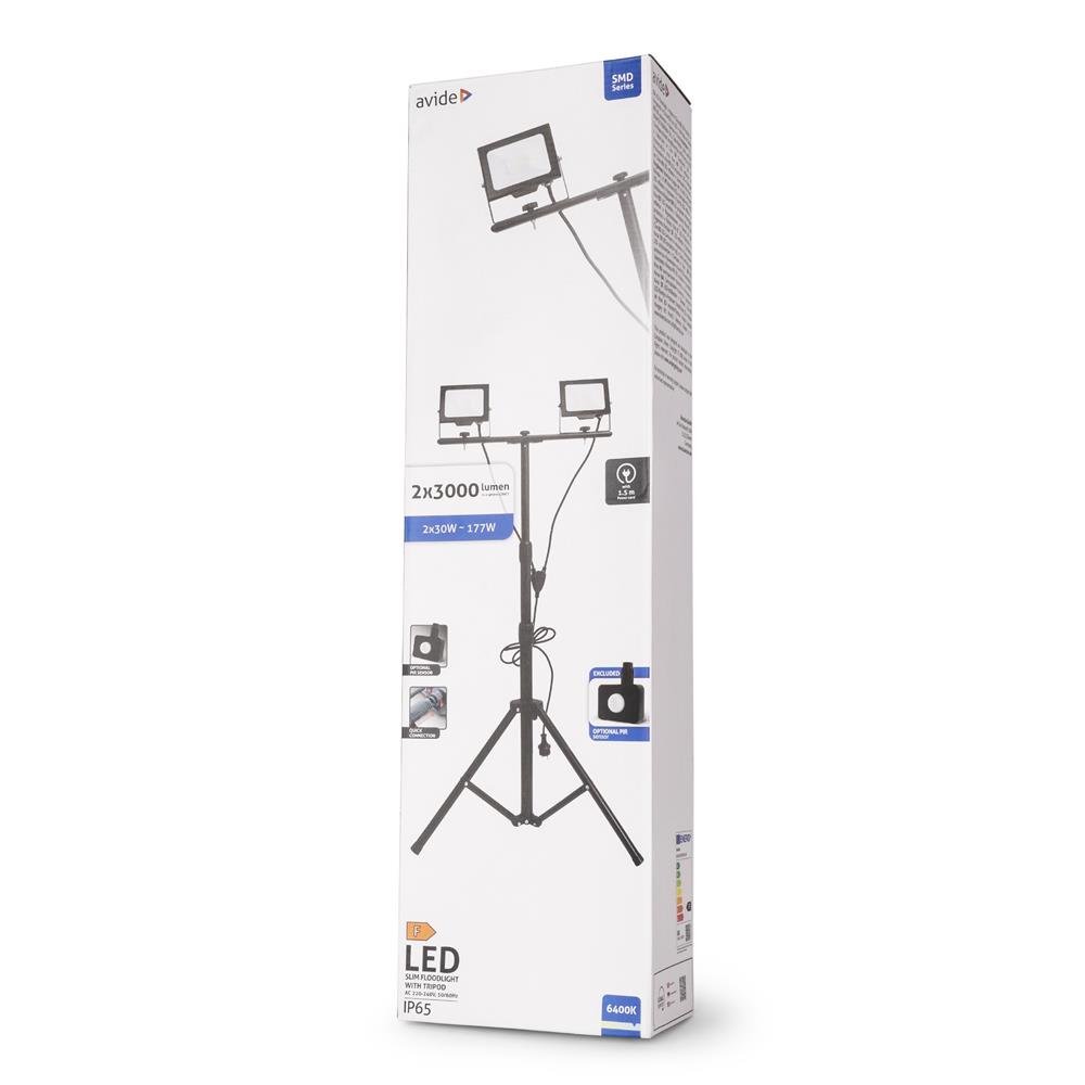 Ο προβολέας Avide Slim διπλού LED με αισθητήρα κίνησης PIR και τρίποδο προσφέρει υψηλή απόδοση φωτισμού, ιδανικός για επαγγελματική και οικιακή χρήση σε εξωτερικούς και εσωτερικούς χώρους.
