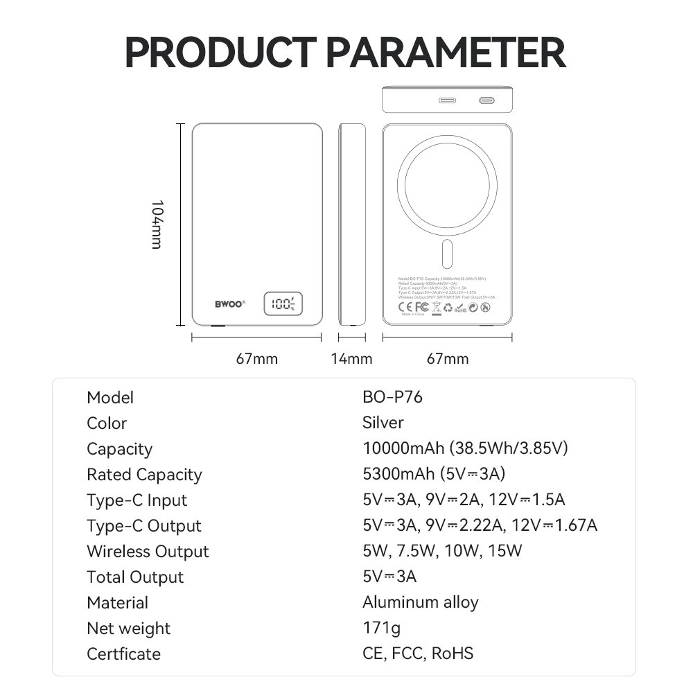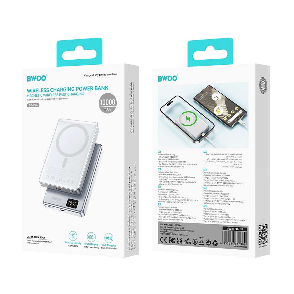 BWOO ultra-slim aluminium magnetic power bank P76 PD 20W 10000 mAh with digital display and USB-C port black (GSM193927)