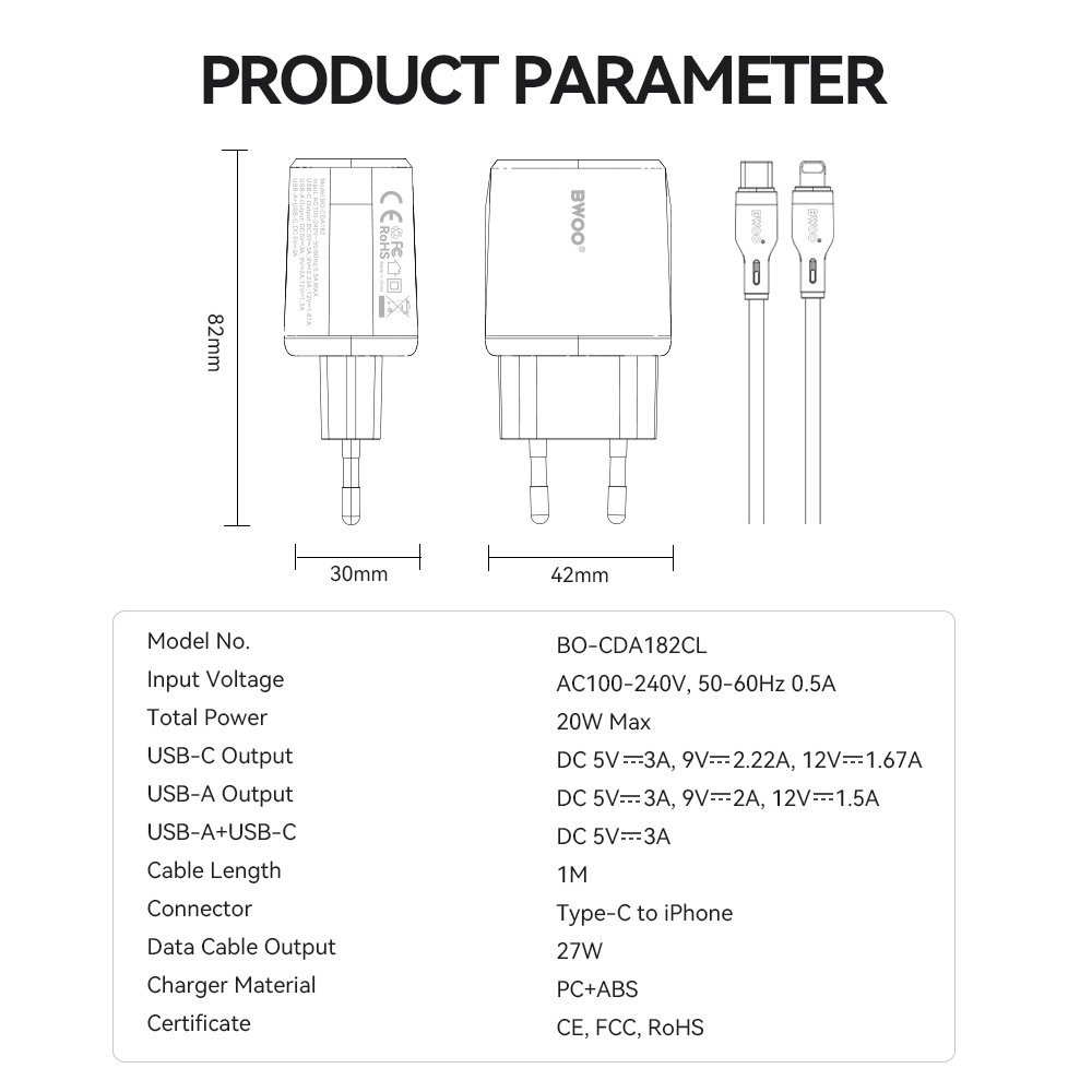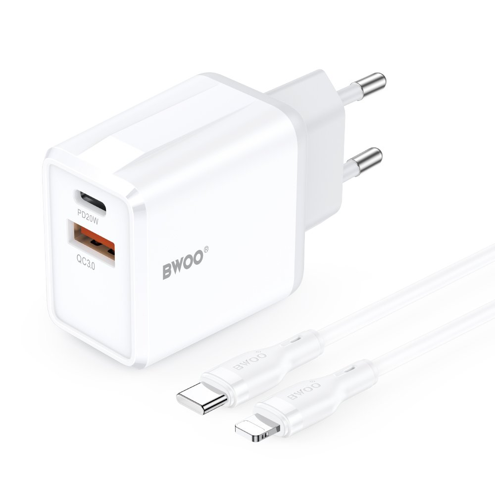 The charger is equipped with two ports — USB-C and USB-A — which allows simultaneous fast charging of two devices. The USB-C port supports the PD protocol and achieves a maximum power of 20W when operating alone. The USB-A port operates based on the QC protocol and offers a maximum power of 18W. When both ports are used simultaneously, the charger provides fast charging at 18W, enabling power to two devices at once. The set includes a USB-C to Lightning cable with a PD 27W.