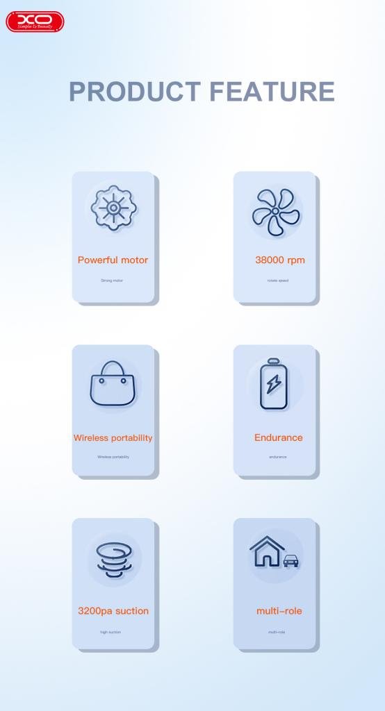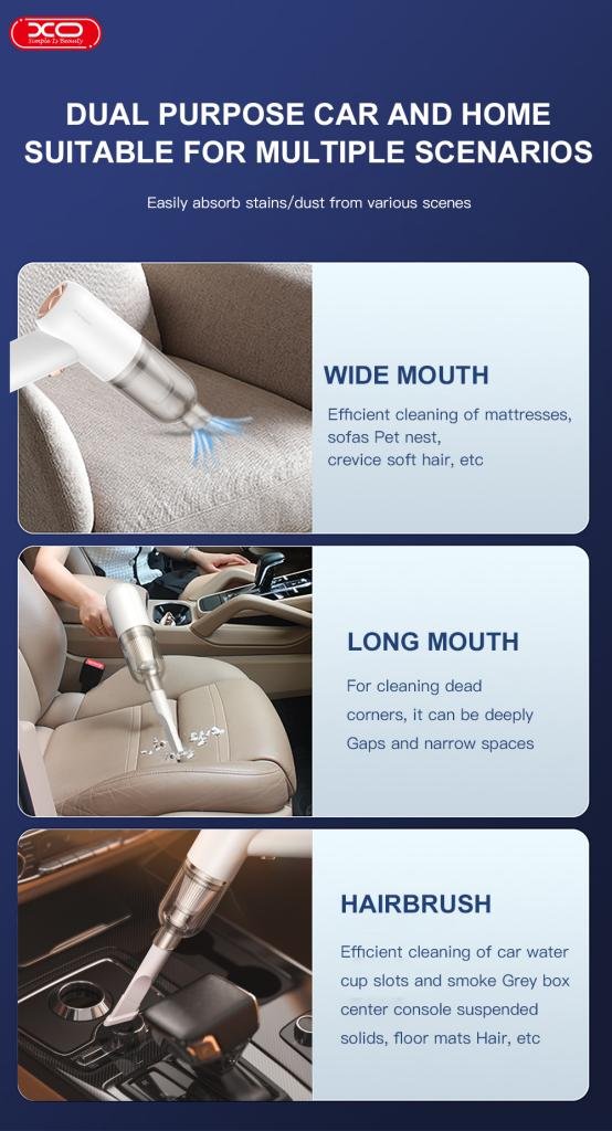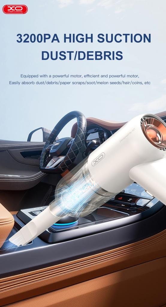 Η XO CZ007 είναι μια ασύρματη ηλεκτρική σκούπα αυτοκινήτου για μικρές εργασίες κατά τον καθαρισμό του αυτοκινήτου με μέγιστη ισχύ 37 W. Μαζί με την ηλεκτρική σκούπα περιλαμβάνεται ένα καλώδιο φόρτισης 5 μέτρων και μια πρόσθετη μύτη επέκτασης για τον καθαρισμό κάθε γωνιάς και σχισμής του αυτοκινήτου.