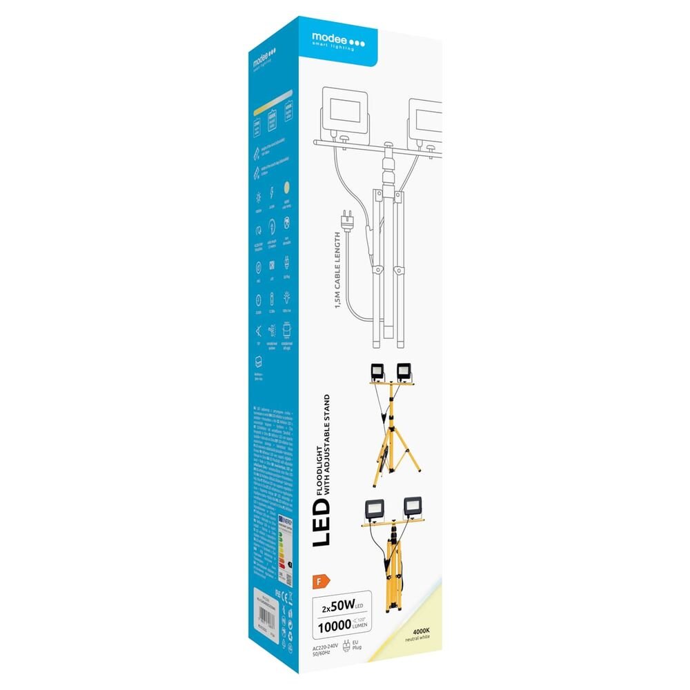Ο προβολέας εργασίας Modee LED με βάση αποτελεί μια ισχυρή και αξιόπιστη λύση φωτισμού, ιδανική για εργοτάξια, συνεργεία, γκαράζ ή εξωτερικούς χώρους εργασίας. Περιλαμβάνει δύο LED προβολείς 50W, με συνολική φωτεινή απόδοση 10.000 lumen. Το ουδέτερο λευκό φως (4000K) προσφέρει φυσικό και καθαρό φωτισμό, μειώνοντας την καταπόνηση των ματιών.
