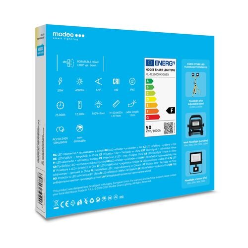 Ανθεκτικός προβολέας Modee E-Series 50W με 4000 lumen, προστασία IP65 και ευρεία δέσμη 120° για ισχυρό και ομοιόμορφο φωτισμό. Ιδανικός για οικιακή ή βιομηχανική χρήση, με περιστρεφόμενη κεφαλή και εύκολη εγκατάσταση.