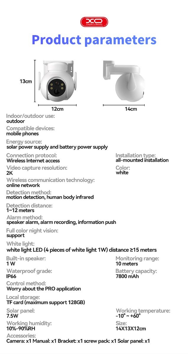 XO CR10 Εξωτερική Ηλιακή Έγχρωμη Κάμερα 300W WiFi (16.001.0185)