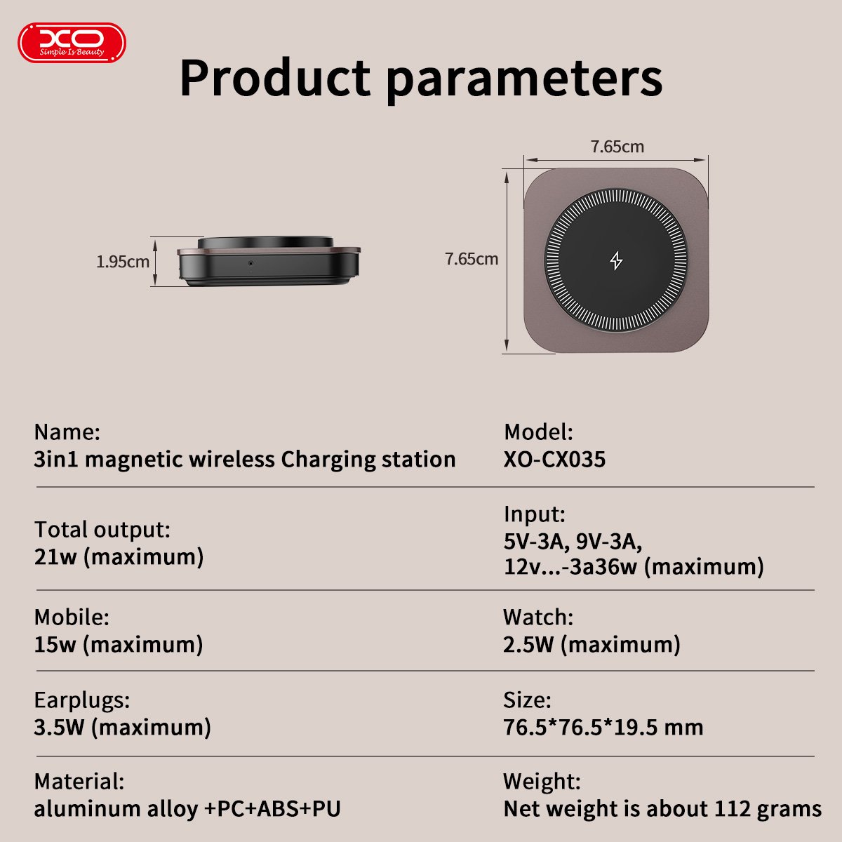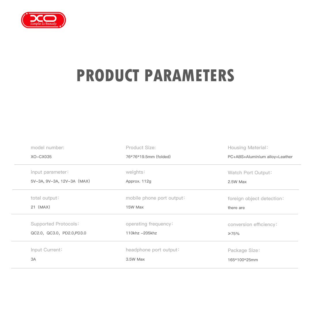 Το XO CX035 είναι μια ευέλικτη και συμπαγής λύση φόρτισης σχεδιασμένη για σύγχρονες συσκευές. Με μέγιστη ισχύ 21 W, υποστηρίζει πολλαπλές επιλογές τάσης, συμπεριλαμβανομένων 5V, 9V και 12V στα 3A, διασφαλίζοντας αποτελεσματική φόρτιση για smartphone και άλλα gadget.