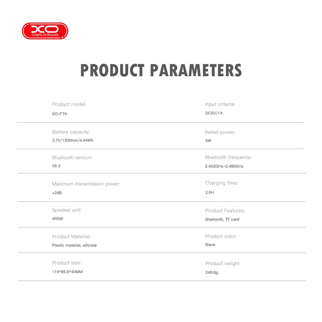 XO F74 φορητό ασύρματο ηχείο με αντοχή στο νερό IP66, Bluetooth 5.4 και υποστήριξη TF. Προσφέρει ισχύ 5W, αυτονομία περίπου 12 ώρες, φόρτιση μέσω Type-C και μπαταρία 1200mAh, ιδανικό για εξωτερική χρήση.