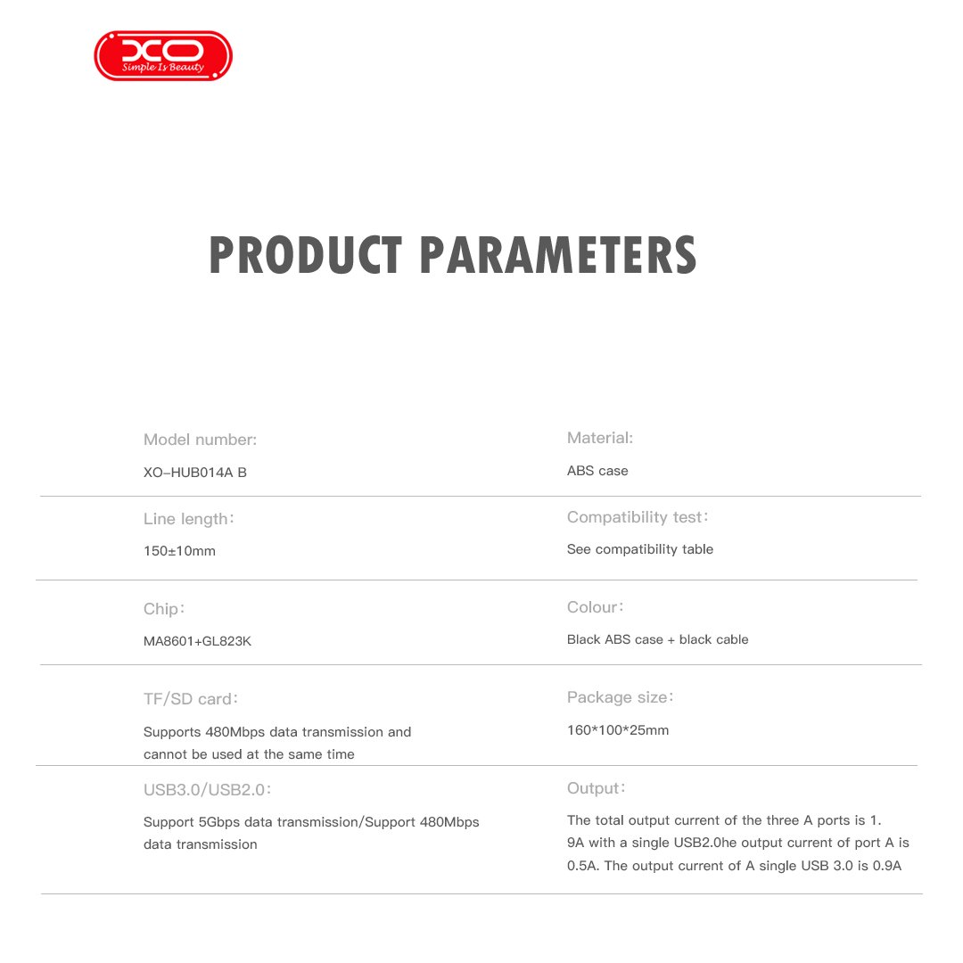 Το USB hub της εταιρείας XO διαθέτει 3 θύρες εξόδου USB 3.0, κατάλληλες για να συνδέσετε ταυτόχρονα στον υπολογιστή, συσκευές όπως ποντίκια, στικάκια, εξωτερικούς σκληρούς δίσκους, πληκτρολόγια και πολλά άλλα. Τροφοδοτείται μέσω του καλωδίου USB που συνδέεται στον υπολογιστή σας.