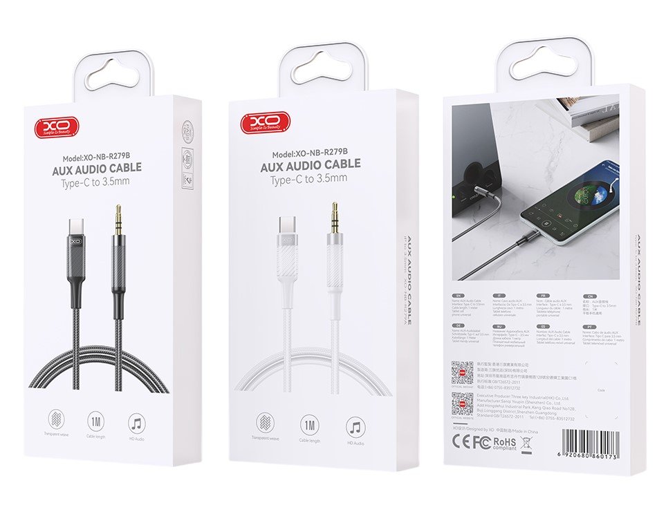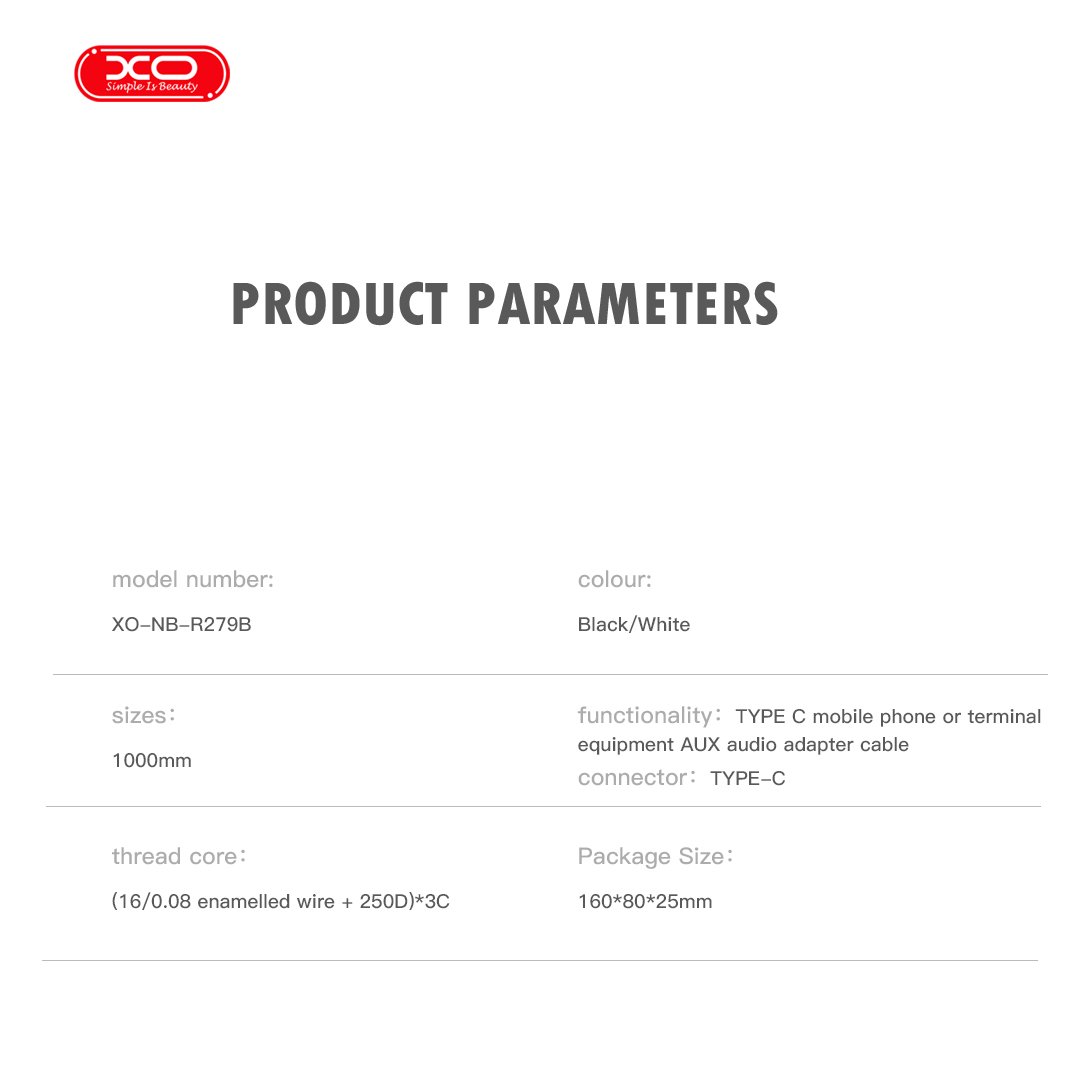 Το XO NB-R279B είναι ένα ανθεκτικό και υψηλής ποιότητας καλώδιο προσαρμογέα ήχου Type-C έως 3,5mm AUX, σχεδιασμένο για απρόσκοπτη συνδεσιμότητα ήχου με φορητές συσκευές Type-C και άλλο συμβατό εξοπλισμό. Με μήκος 1 m και ενισχυμένο πυρήνα νήματος (16/0,08 εμαγιέ σύρμα + 250D) 3C, εξασφαλίζει σταθερή μετάδοση σήματος και καθαρή ποιότητα ήχου.