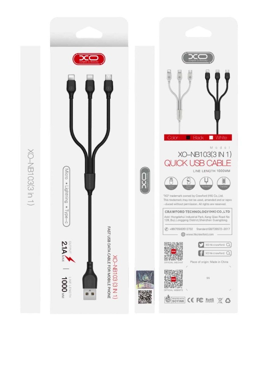 Το XO NB103 είναι ένα καλώδιο εξοπλισμένο με 3 υποδοχές φόρτισης.Το καλώδιο έχει σχεδιαστεί για να εξασφαλίζει τη μεγαλύτερη δυνατή άνεση για καθημερινή χρήση.Κατασκευασμένο από εύκαμπτη σιλικόνη για να εξασφαλίζει τον μεγαλύτερο δυνατό χρόνο χρήσης.Συσκευασία: 50 τμχ