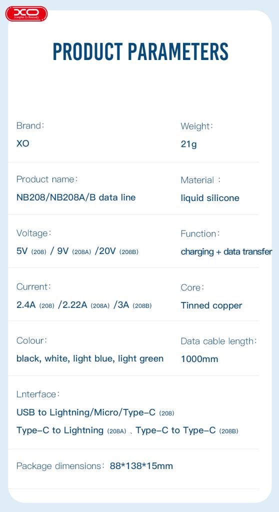 XO NB208 καλώδιο φόρτισης, που συνδέει συσκευές με υποδοχή Lightning στη θύρα USB του υπολογιστή ή του φορτιστή για συγχρονισμό και φόρτιση.Με μήκος 1m, είναι αρκετά επαρκές για τον ταυτόχρονο χειρισμό της συσκευής κατά την φόρτιστη της, ακόμα και αν ο φορτιστής δεν είναι δίπλα σε αυτή.