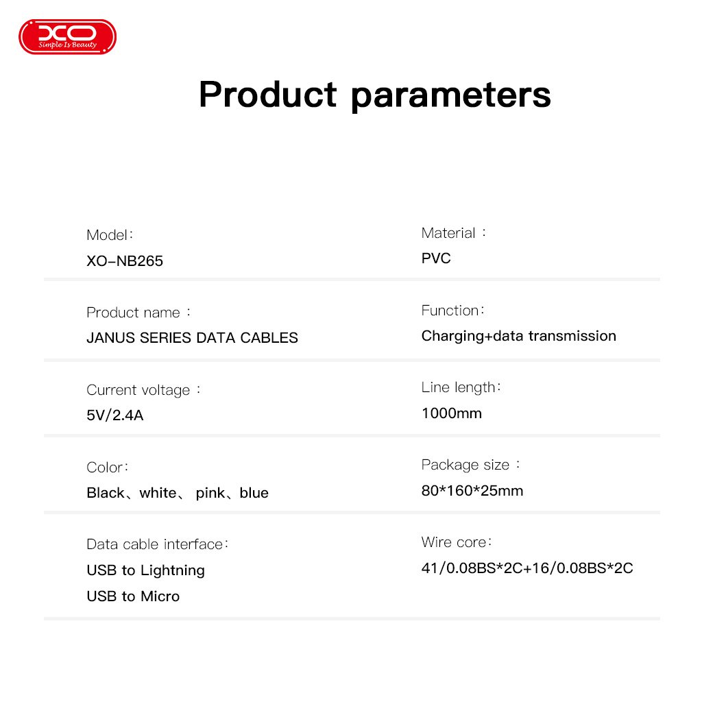 Το XO NB265 είναι ένα καλώδιο εξοπλισμένο με υποδοχή USB σε Lightning. Το καλώδιο έχει σχεδιαστεί για να παρέχει τη μεγαλύτερη δυνατή άνεση για καθημερινή χρήση. Κατασκευασμένο από εύκαμπτη σιλικόνη για να εξασφαλίζει τη καλύτερη δυνατή χρήση. Μια ευρύτερη επιλογή χρωμάτων θα σας επιτρέψει να ξεχωρίσετε.