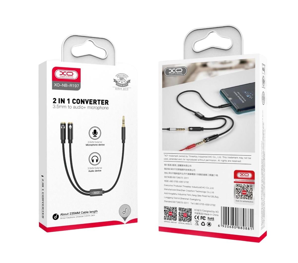 Το XO NB-R197 είναι ένας προσαρμογέας από υποδοχή υποδοχής 3,5 χιλιοστών σε υποδοχή υποδοχής 3,5 χιλιοστών και είσοδο μικροφώνου αφιερωμένη σε συσκευές, σας επιτρέπει να διαχωρίσετε την υποδοχή υποδοχής 3,5 χιλιοστών και να συνδέσετε το μικρόφωνο και τα ακουστικά σε αυτήν ξεχωριστά σε smartphone, υπολογιστές και άλλες συσκευές.