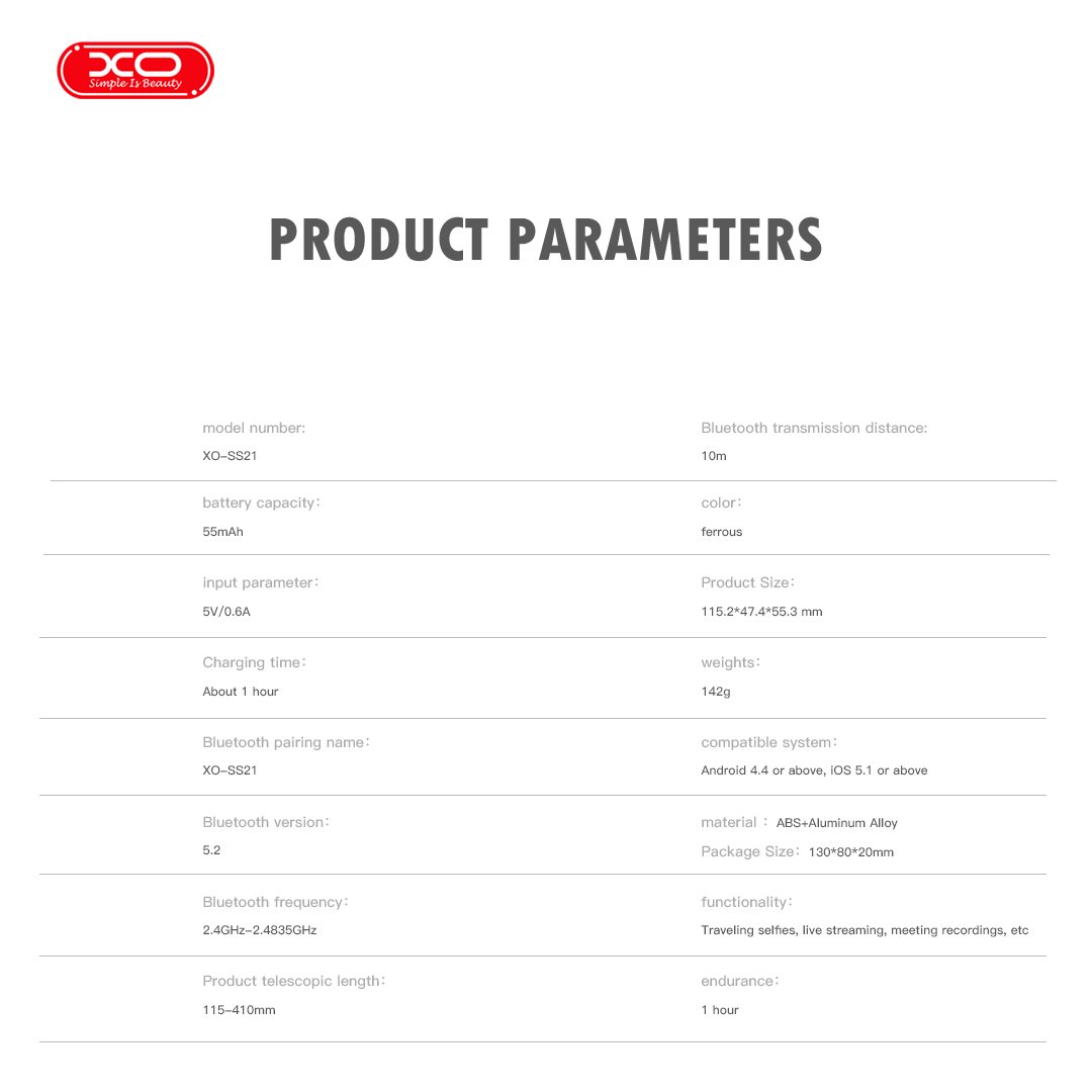 Το XO SS21 είναι ένα μίνι Bluetooth selfie stick 4 σε 1, με επεκτάσιμη λαβή, λειτουργία τρίποδου και τηλεχειριστήριο για εύκολες και σταθερές φωτογραφίες και βίντεο με το κινητό σας.
