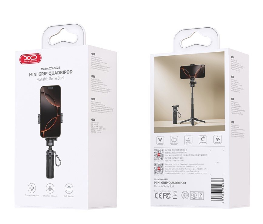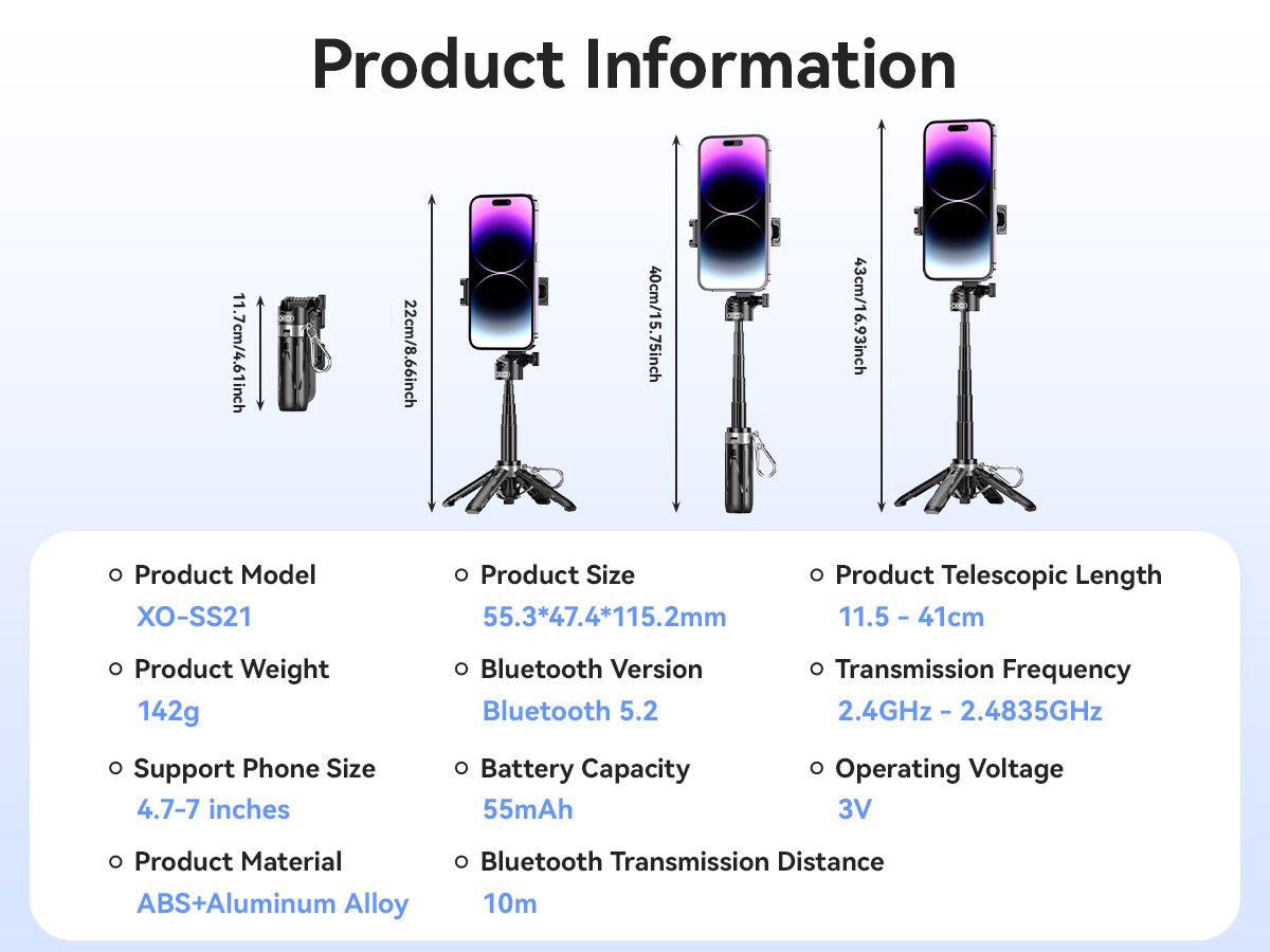Το XO-SS21 είναι ένα ευέλικτο selfie stick Bluetooth 3 σε 1, σχεδιασμένο για smartphones πλάτους 63–97 χιλιοστών. Με εμβέλεια Bluetooth 10 μέτρων και γρήγορο χρόνο φόρτισης 1 ώρας, είναι ιδανικό για να απαθανατίζετε στιγμές εν κινήσει. Η μπαταρία 55mAh του προσφέρει μια σταθερή και φιλική προς το χρήστη εμπειρία, ενώ ο επεκτάσιμος σχεδιασμός του εκτείνεται από 11,5 έως 41 cm, λειτουργώντας και ως τρίποδο με μέγιστο ύψος 41 cm.