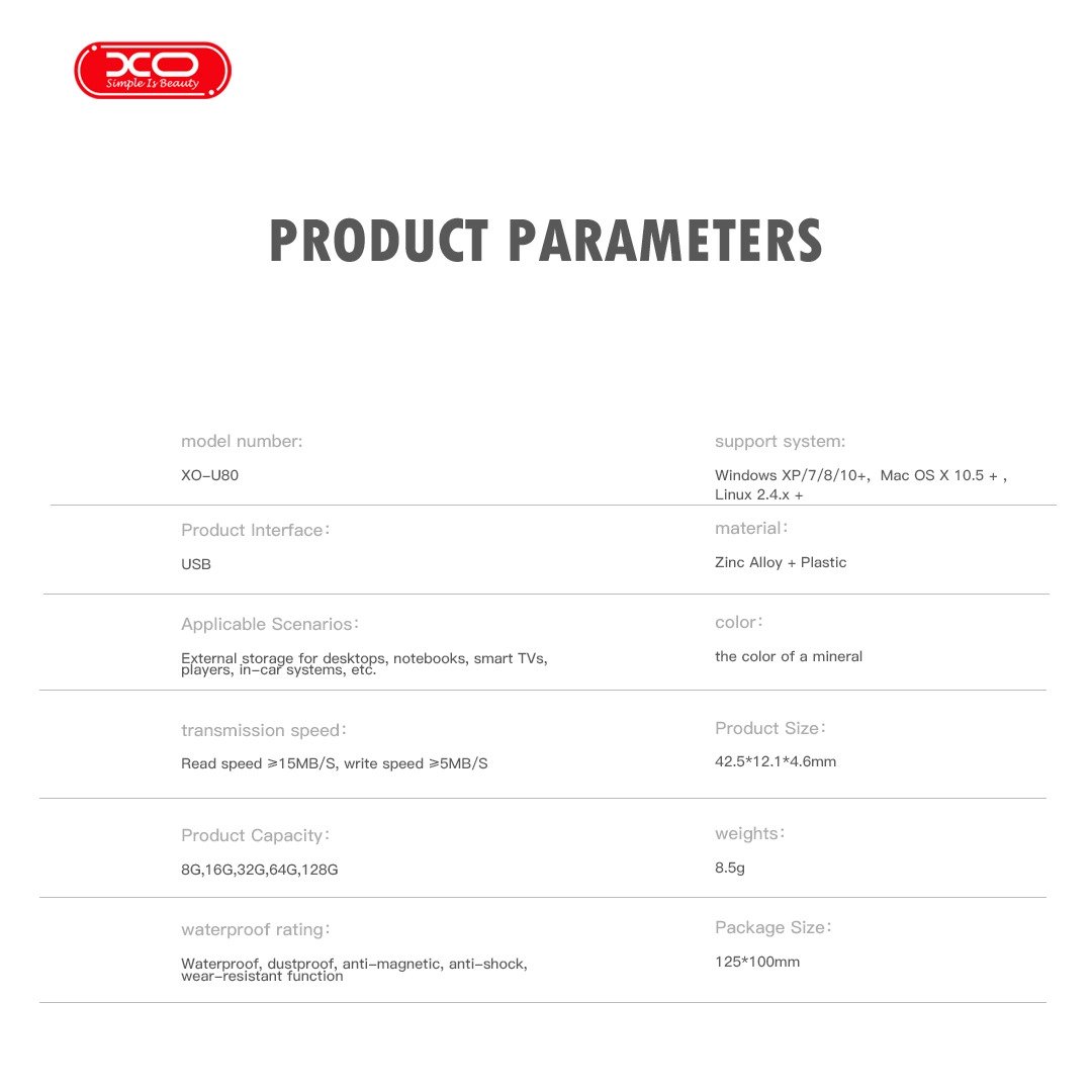 Αποθηκεύστε και μεταφέρετε τα αρχεία σας με ασφάλεια με το XO U80 Flash Drive, ένα συμπαγές USB 2.0, ιδανικό για καθημερινή χρήση. Η ανθεκτική κατασκευή από κράμα ψευδαργύρου είναι αδιάβροχη, ανθεκτική σε κραδασμούς και στη φθορά για μακροχρόνια απόδοση. Συμβατό με υπολογιστές, φορητούς, smart TV και συστήματα αυτοκινήτου, προσφέρει εύκολη χρήση με plug-and-play και σταθερές ταχύτητες ανάγνωσης/εγγραφής. Ιδανικό για ασφαλή μεταφορά εγγράφων, φωτογραφιών και πολυμέσων όπου κι αν βρίσκεστε.