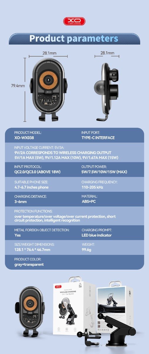 Το XO WX038 είναι μια βάση με ασύρματη φόρτιση 15W και βεντούζα για το ταμπλό του αυτοκινήτου σας. Το μικρό του μέγεθος ταιριάζει απόλυτα σε κάθε χώρο.